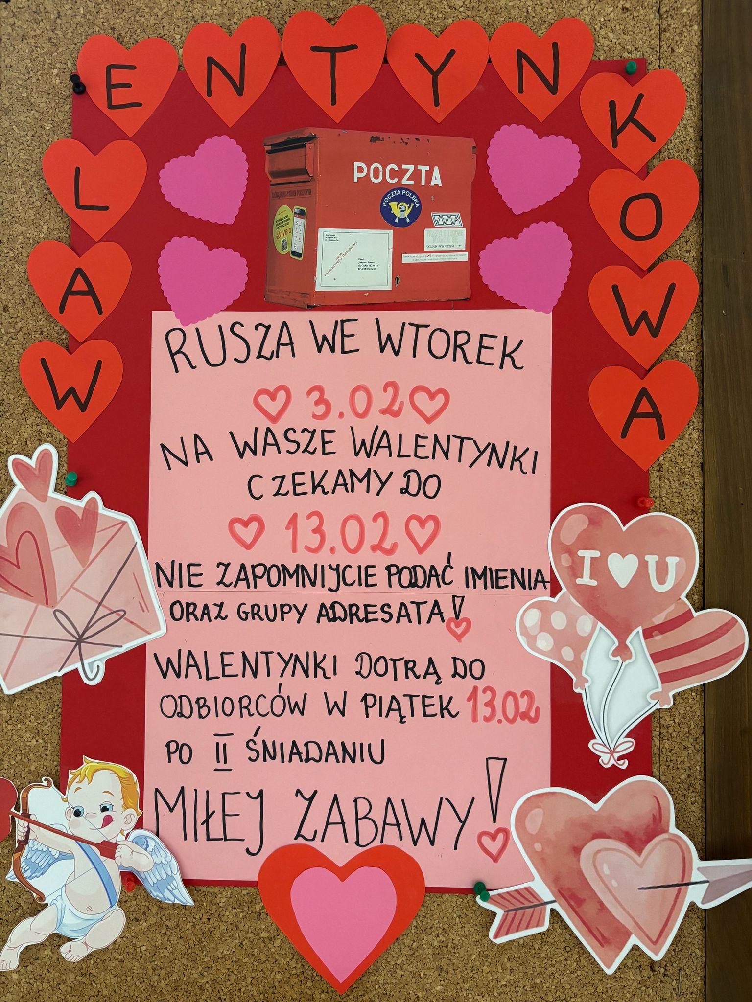 Od wtorku 4.02.2026 roku ruszyła w naszym przedszkolu Poczta Walentynkowa. W holu głównym ustawiona jest skrzynka pocztowa, do której można wrzucać wykonane przez dzieci Walentynki. Karteczki można wrzucać do skrzynki do piątku 13.02.2026 roku. Walentynki zostaną dostarczone do adresatów w piątek 13.02.2026 po II śniadaniu.