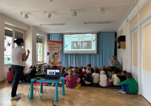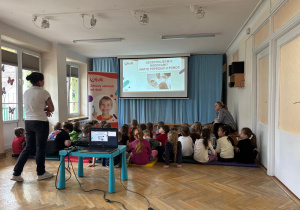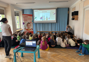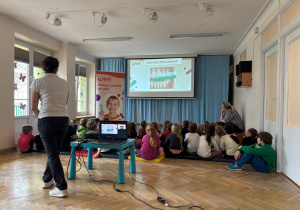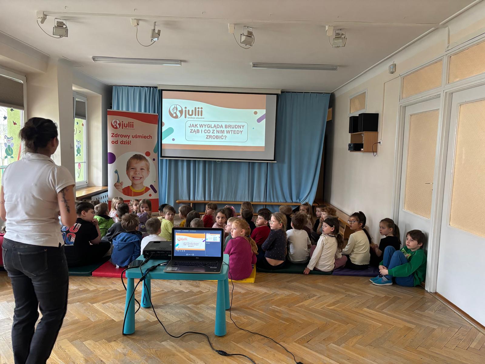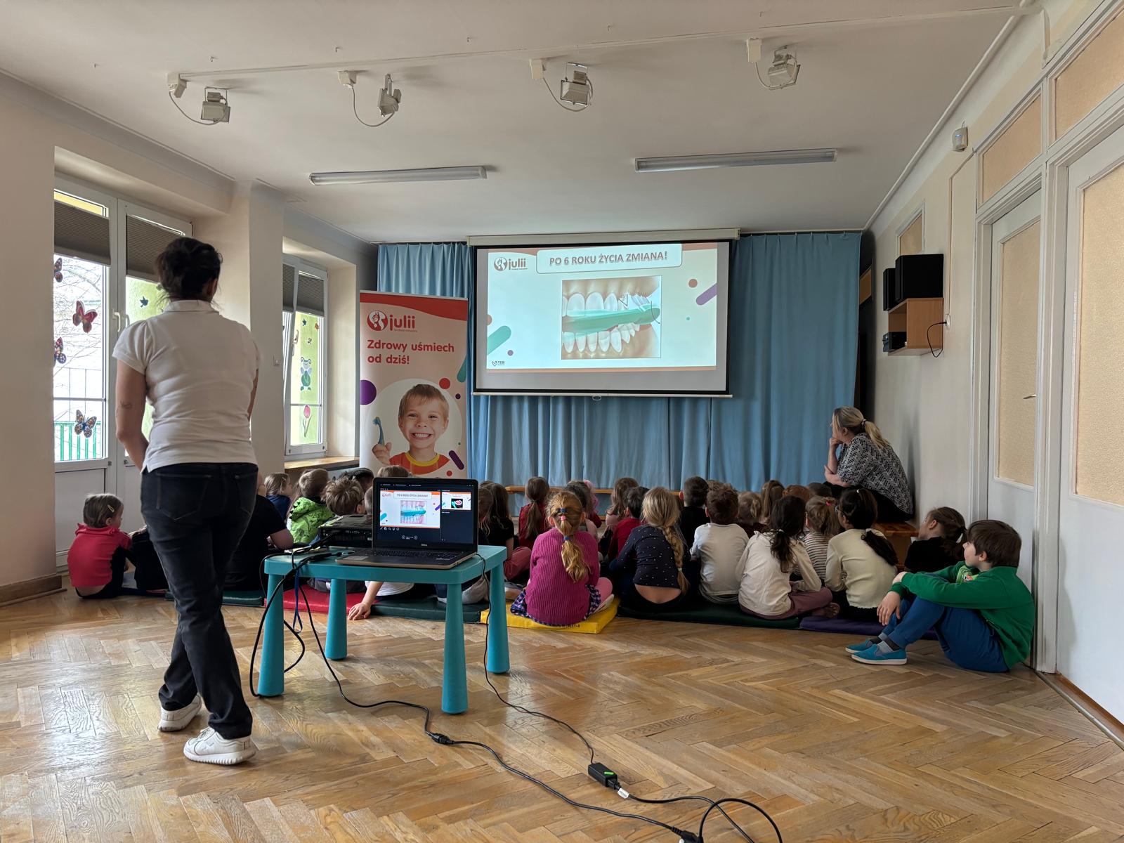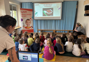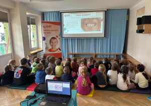 Dnia 30 marca 2026 roku odbyły się w naszym przedszkolu warsztaty higieniczne pt. "Jak wygląda brudny ząb"? przeprowadzone przez Fundację Wiewiórki Julii. Podczas spotkania dzieci dowiedziały się o tym, jak wygląda brudny ząb i o tym, co z nim wtedy zrobić. Prowadząca przekazała przedszkolakom, że na zębach może pojawić się płytka nazębna, kamień nazębny oraz osad nazębny. Niektóre z nich możemy usunąć samodzielnie w domu za pomocą szczoteczki. Dzieci poznały różne ich rodzaje, wiedzą już, że może być szczoteczka manualna, która czyści zęby z pomocą dziecięcych rączek, ale są też i szczoteczki elektryczne oraz soniczne, które "same" usuwają wszystkie "brudki" z naszych ząbków. Najważniejsza jest systematyczność mycia zębów, co najmniej 2 razy dziennie - rano i wieczorem, ale można i częściej ;) Najważniejszy wniosek? Tylko jeden „brud” da się usunąć samodzielnie – ten, który usuwamy CODZIENNIE! Dlatego regularne mycie zębów to najważniejsza rzecz! Dzieci poznały też różne środki higieniczne ułatwiające zlokalizowanie "brudków" na ich zębach.