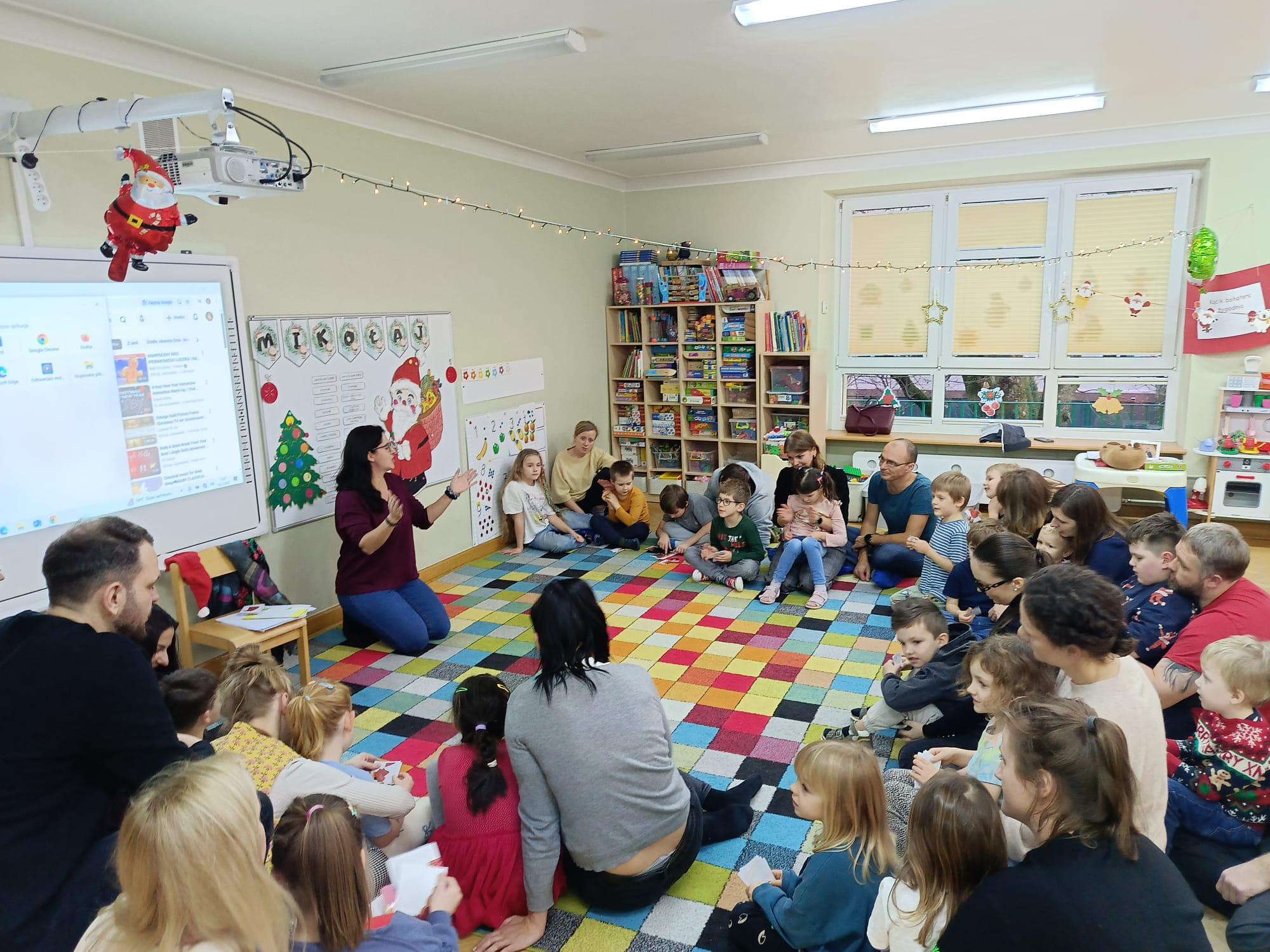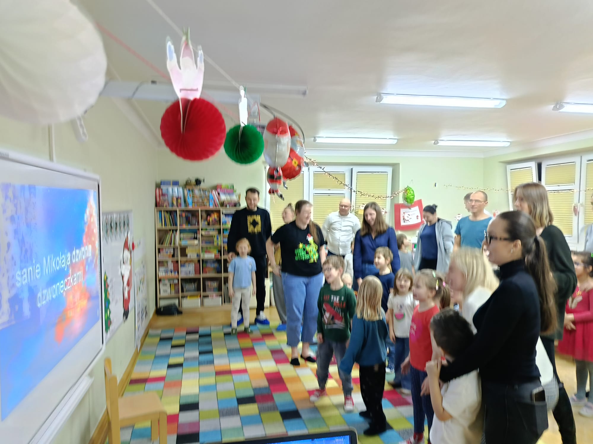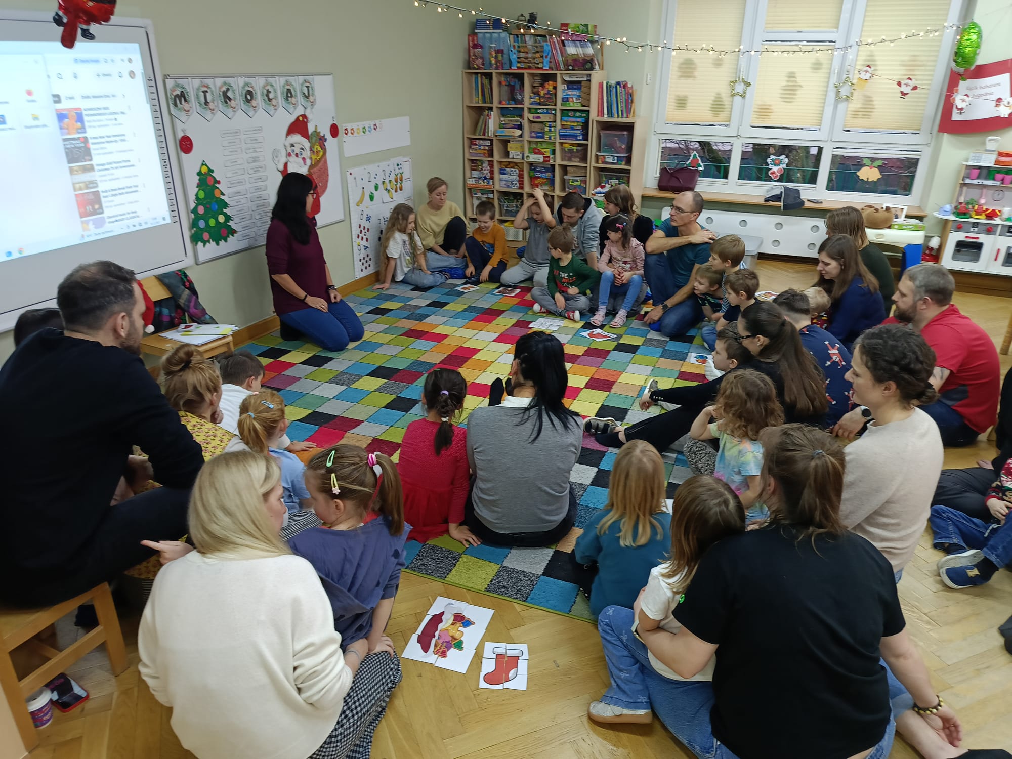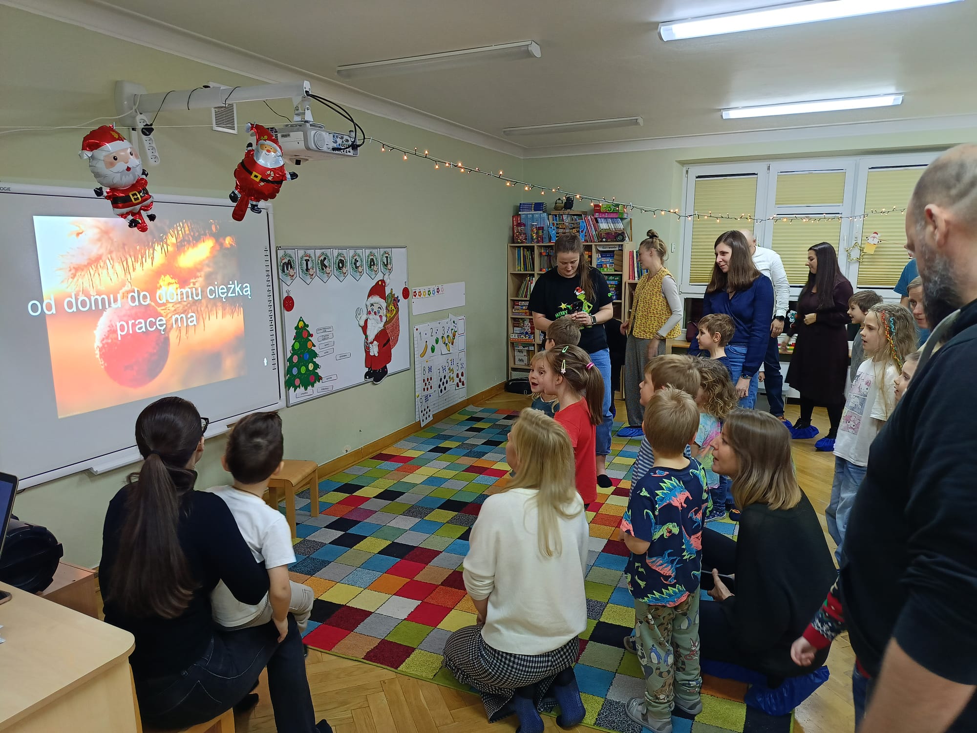 W dniu 10 grudnia 2025 roku odbyły się w grupie II "MISIE" zajęcia otwarte dla Rodziców, których tematem były "Zwyczaje bożonarodzeniowe". Celem przeprowadzonych zajęć było zapoznanie dzieci z tradycjami bożonarodzeniowymi naszego kraju. W ramach zajęć dzieci układały puzzle z obrazkami przedstawiającymi tradycje Bożego Narodzenia, które miały je wprowadzić w temat zajęć. Następną aktywnością podczas zajęć była opowieść ruchowa "Wyprawa po choinkę", podczas, której dzieci z rodzicami inscenizowały ruchem treść opowiadania. Następnie do pracy ruszyły dziecięce noski, których zadaniem było odgadnięcie, co kryje się w słoiczku. Później wszyscy wspólnie pobawiliśmy się w zabawę słuchowo - wzrokowo - ruchową "Jingle bells" z wykorzystaniem tablicy multimedialnej. Na zakończenie naszego spotkania dzieci wspólnie z rodzicami zaśpiewały piosenkę "A Mikołaj pędzi" wyświetlaną na tablicy multimedialnej podczas zabawy karaoke, a następnie rodzice zaśpiewali swoim dzieciom piosenkę "Nie miały aniołki choinki na święta". Zarówno dzieci, jak i rodzice wykazali się dużym zaangażowaniem wobec zaproponowanych aktywności. Wspólne wykonanie piosenek przyniosło przedszkolakom wiele radości i po raz kolejny były okazją do wspólnej, wesołej zabawy.
