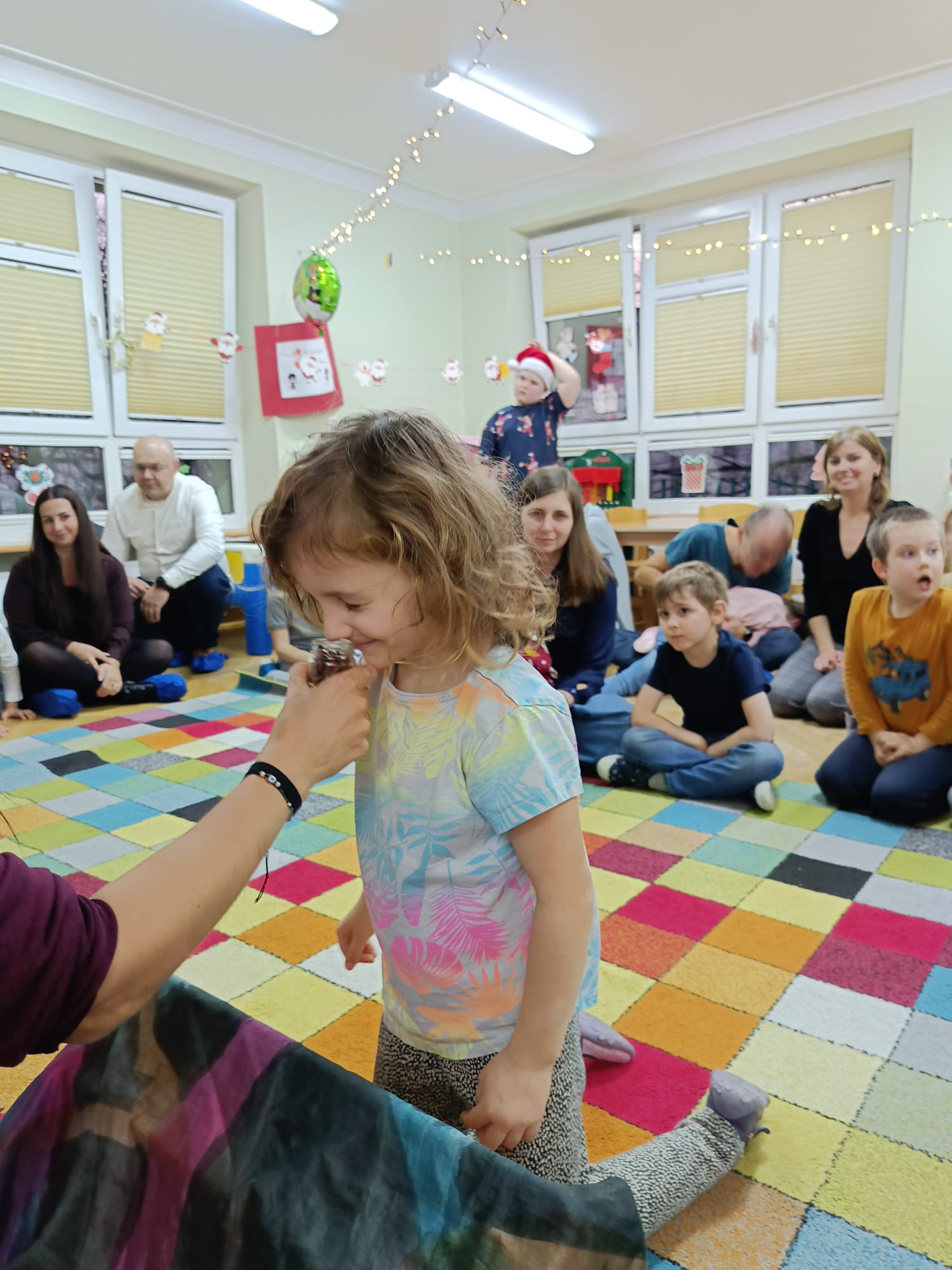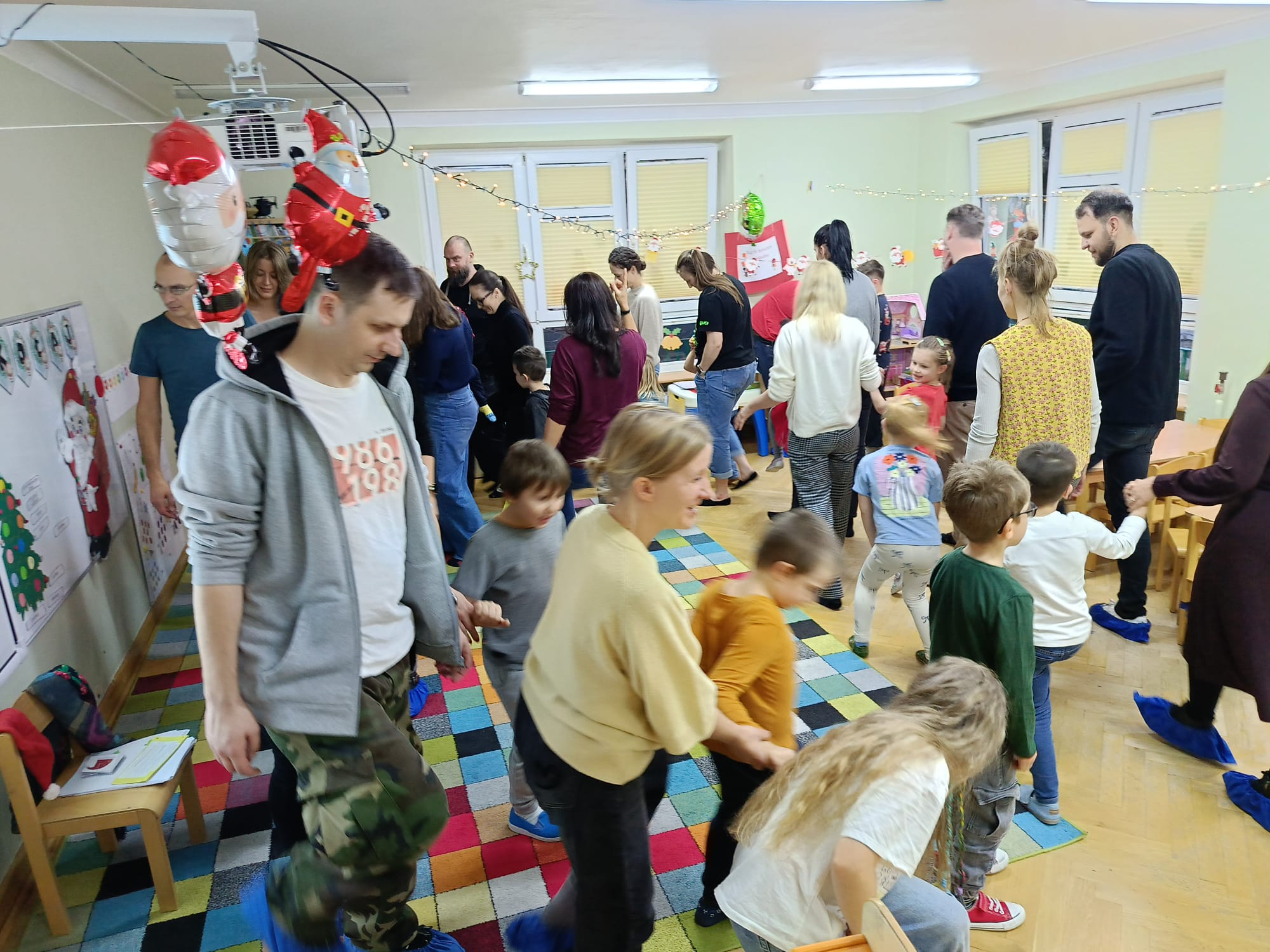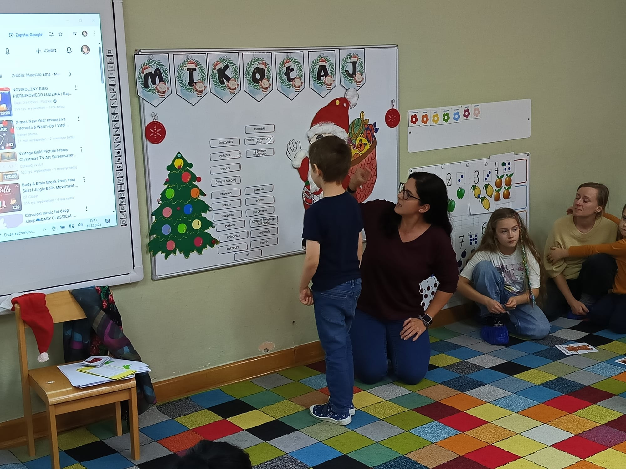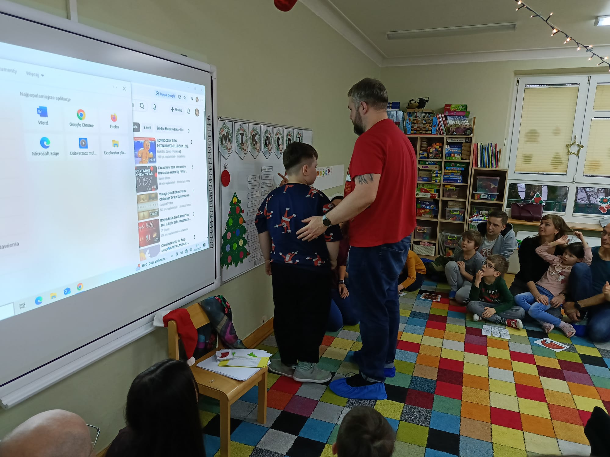 W dniu 10 grudnia 2025 roku odbyły się w grupie II "MISIE" zajęcia otwarte dla Rodziców, których tematem były "Zwyczaje bożonarodzeniowe". Celem przeprowadzonych zajęć było zapoznanie dzieci z tradycjami bożonarodzeniowymi naszego kraju. W ramach zajęć dzieci układały puzzle z obrazkami przedstawiającymi tradycje Bożego Narodzenia, które miały je wprowadzić w temat zajęć. Następną aktywnością podczas zajęć była opowieść ruchowa "Wyprawa po choinkę", podczas, której dzieci z rodzicami inscenizowały ruchem treść opowiadania. Następnie do pracy ruszyły dziecięce noski, których zadaniem było odgadnięcie, co kryje się w słoiczku. Później wszyscy wspólnie pobawiliśmy się w zabawę słuchowo - wzrokowo - ruchową "Jingle bells" z wykorzystaniem tablicy multimedialnej. Na zakończenie naszego spotkania dzieci wspólnie z rodzicami zaśpiewały piosenkę "A Mikołaj pędzi" wyświetlaną na tablicy multimedialnej podczas zabawy karaoke, a następnie rodzice zaśpiewali swoim dzieciom piosenkę "Nie miały aniołki choinki na święta". Zarówno dzieci, jak i rodzice wykazali się dużym zaangażowaniem wobec zaproponowanych aktywności. Wspólne wykonanie piosenek przyniosło przedszkolakom wiele radości i po raz kolejny były okazją do wspólnej, wesołej zabawy.