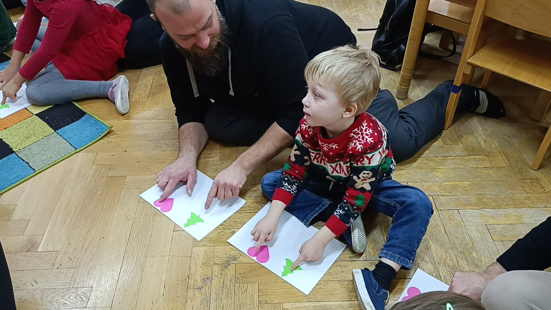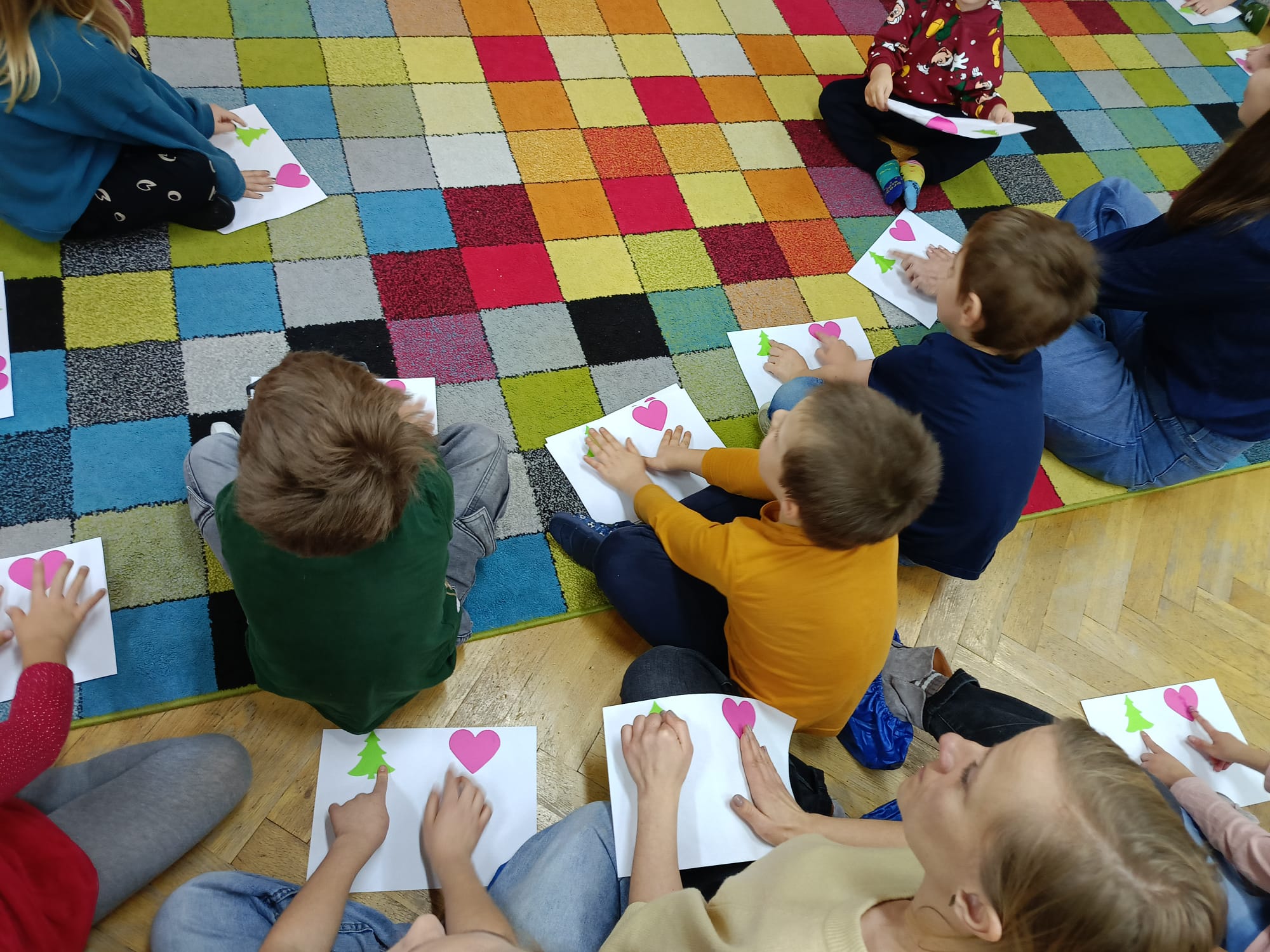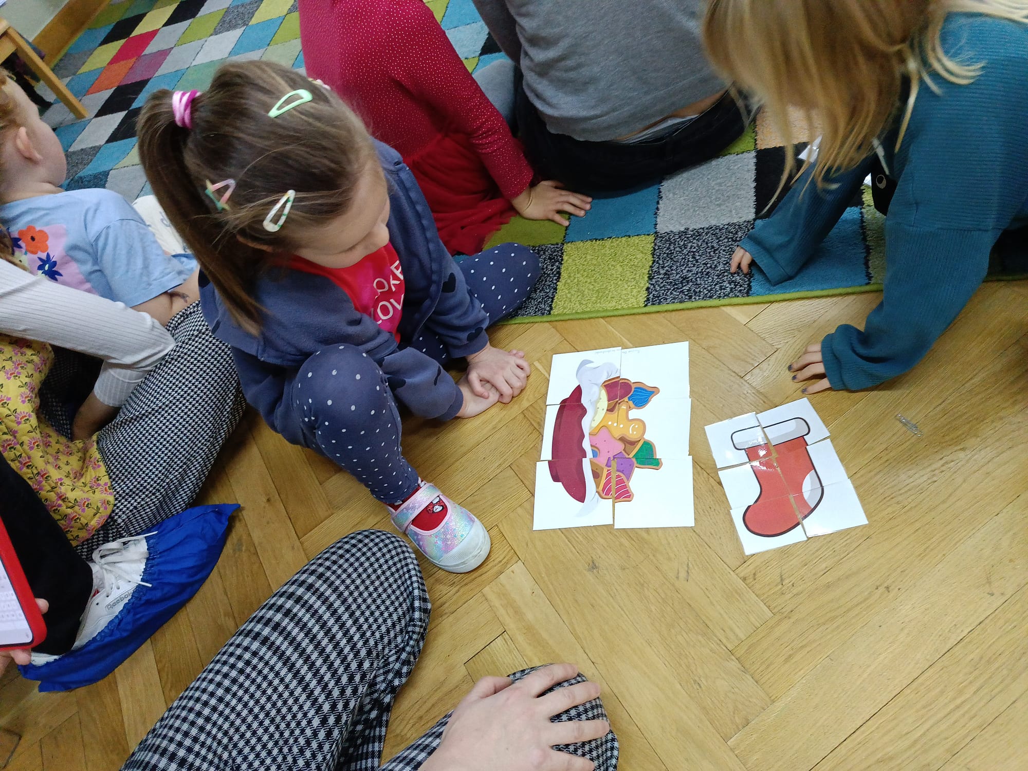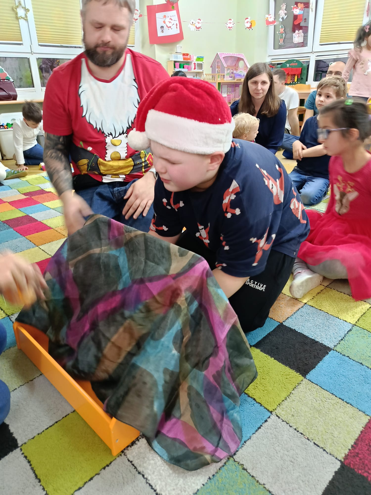 W dniu 10 grudnia 2025 roku odbyły się w grupie II "MISIE" zajęcia otwarte dla Rodziców, których tematem były "Zwyczaje bożonarodzeniowe". Celem przeprowadzonych zajęć było zapoznanie dzieci z tradycjami bożonarodzeniowymi naszego kraju. W ramach zajęć dzieci układały puzzle z obrazkami przedstawiającymi tradycje Bożego Narodzenia, które miały je wprowadzić w temat zajęć. Następną aktywnością podczas zajęć była opowieść ruchowa "Wyprawa po choinkę", podczas, której dzieci z rodzicami inscenizowały ruchem treść opowiadania. Następnie do pracy ruszyły dziecięce noski, których zadaniem było odgadnięcie, co kryje się w słoiczku. Później wszyscy wspólnie pobawiliśmy się w zabawę słuchowo - wzrokowo - ruchową "Jingle bells" z wykorzystaniem tablicy multimedialnej. Na zakończenie naszego spotkania dzieci wspólnie z rodzicami zaśpiewały piosenkę "A Mikołaj pędzi" wyświetlaną na tablicy multimedialnej podczas zabawy karaoke, a następnie rodzice zaśpiewali swoim dzieciom piosenkę "Nie miały aniołki choinki na święta". Zarówno dzieci, jak i rodzice wykazali się dużym zaangażowaniem wobec zaproponowanych aktywności. Wspólne wykonanie piosenek przyniosło przedszkolakom wiele radości i po raz kolejny były okazją do wspólnej, wesołej zabawy.
